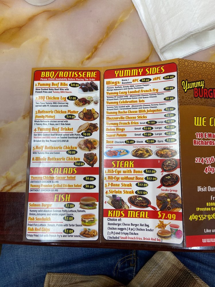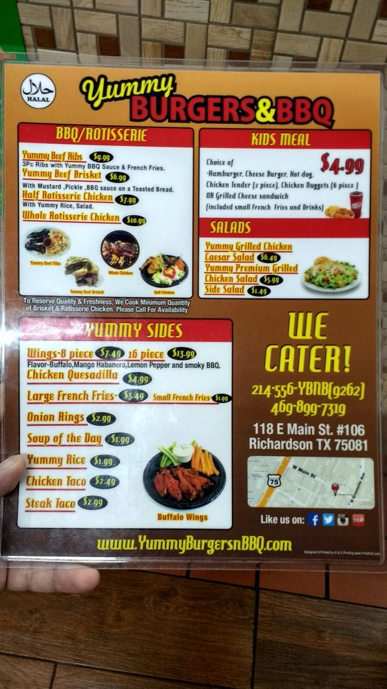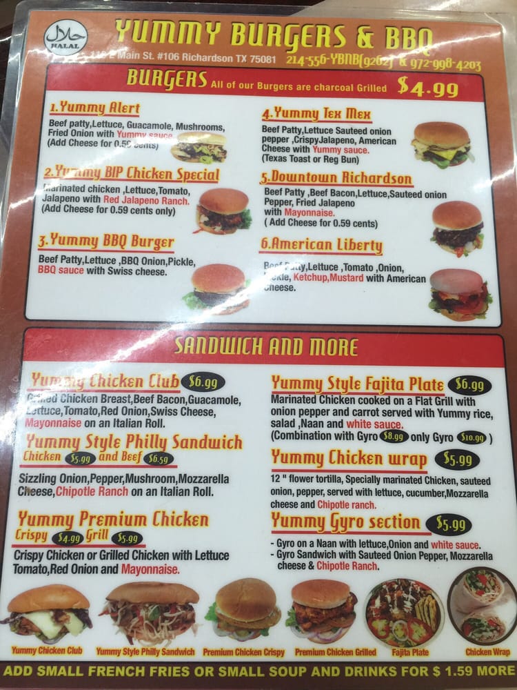 Yummy Burgers & BBQ is a casual yet classy restaurant located at 118 E Main St Ste 106 Richardson, TX. Known for their delicious barbeque, sandwiches, and burgers, this establishment offers a wide range of options for all types of diners. The menu includes many vegetarian choices along with happy hour specials and a variety of alcoholic beverages. Customers rave about the flavorful gyro meat, unique sauces, and standout dishes like the Philly cheesesteak sandwich and chicken sandwich. With options for delivery, takeout, reservations, and catering, Yummy Burgers & BBQ caters to a diverse range of preferences. The restaurant prides itself on friendly staff, clean premises, and quick service, making it a must-visit for both locals and out-of-towners alike. Experience the fresh flavors and great value of Yummy Burgers & BBQ for yourself - you won't be disappointed.